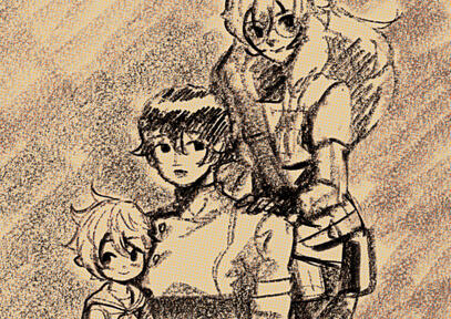 Sketch of Momotaro, his mother, Okano and her assistant, Ayeka, pre-calamity. Illustration curtesy of a certain doman artist.
